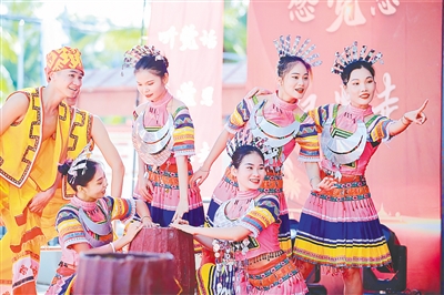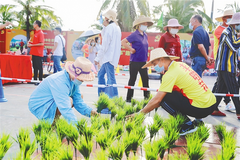 舞台上,歌唱舞蹈表演精彩纷呈;竞赛区,手插青秧、男女押加、背“媳”挑战,激情又刺激。趣味竞赛活动中,比赛项目纷繁多样,趣味十足。随着一声哨响,“手把青秧插满田”比赛开始了,4位平均年龄50岁的“农家好手”像小伙子般冲进比赛场地,在由木板制成的“插秧区”里一展风采。参加“阿哥阿妹赶椰忙”活动的“大部队”也不甘示弱,一人一棍两椰子,誓要比比谁最快。一个个冠军产生,一阵阵欢呼此起彼伏,比赛现场成了欢乐的海洋。