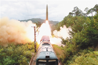 这张朝中社9月16日提供的图片显示的是朝鲜军方15日举行的铁路机动导弹试射现场。
