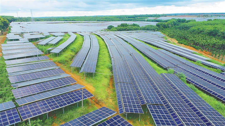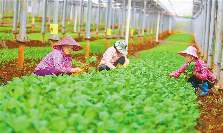 日前,海口市琼山区甲子镇一菜篮子农光互补常年蔬菜种植基地(图①)内,农户在采摘蔬菜(图②)。该基地采用农光互补立体农业模式,实现大棚发电、种菜“两不误”,其生产的菜心等种植周期在32天至40天,比之前缩短近半个月,有效缓解海南夏秋季叶菜种植难题。