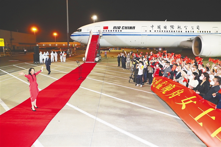 21时50分许,飞机稳稳降落,机场灯火通明,机身上的五星红旗格外醒目。舱门打开,着一袭红裙的孟晚舟向等候在这里的欢迎人群挥手致意,现场爆发热烈欢呼。