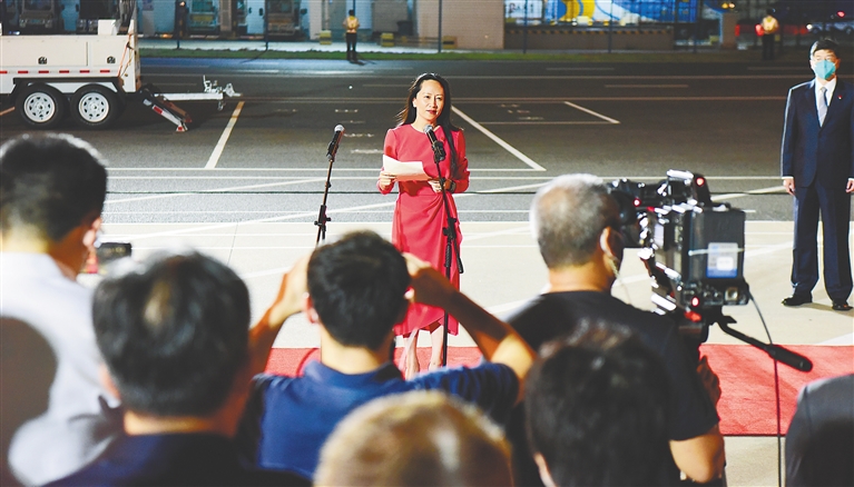 9月25日,中国公民孟晚舟乘坐中国政府包机返回祖国。这是党中央坚强领导的结果,是中国政府不懈努力的结果,是全中国人民鼎力支持的结果,是中国人民的重大胜利。