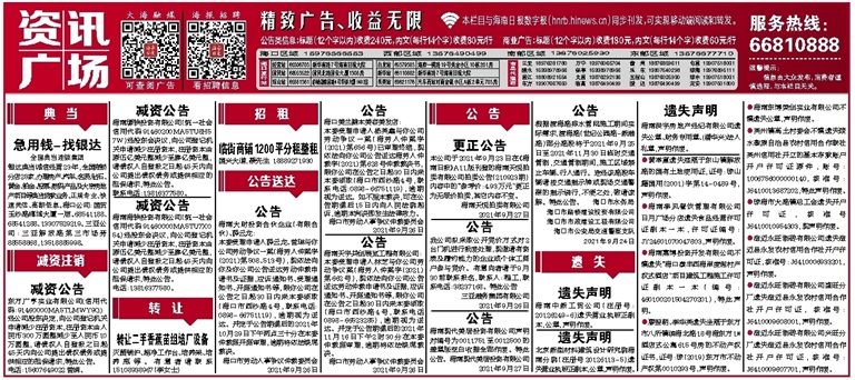 本公司于2021年9月23日在《海南日报》A11版刊登的海南天悦拍卖有限公司拍卖公告(210923期)内容中的“参考价:4.93万元”更正为无底价拍卖,其它内容不变。