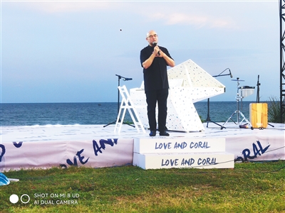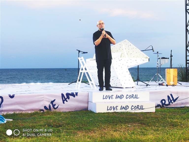 9月16日傍晚,“爱与珊瑚乐享会”如期举行,环保钢琴首次在万宁亮相,孔祥东最后压轴用它即兴创作演奏。动听的钢琴声环绕在日月湾,并经由现场直播传向四面八方。弹到酣处,孔祥东边朗诵他自己作的诗边即兴弹琴。他的琴音是关于爱的主题。人们在海边感受着音乐的美好,享受着海边的美景,吸收着关于海洋生态保护的理念。