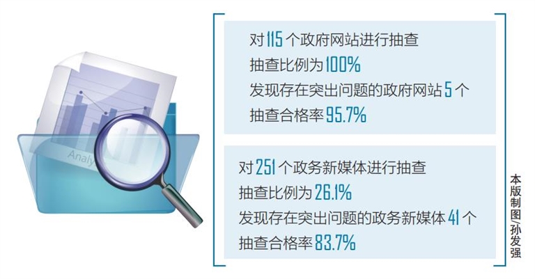 省政府办公厅对全省正在运行的115个政府网站进行了抽查,抽查比例为100%,发现存在突出问题的政府网站5个,抽查合格率95.7%;对全省正在运行的960个政务新媒体中的251个进行了抽查,抽查比例为26.1%,发现存在突出问题的政务新媒体41个,抽查合格率83.7%。
