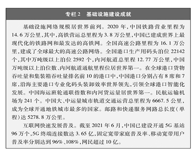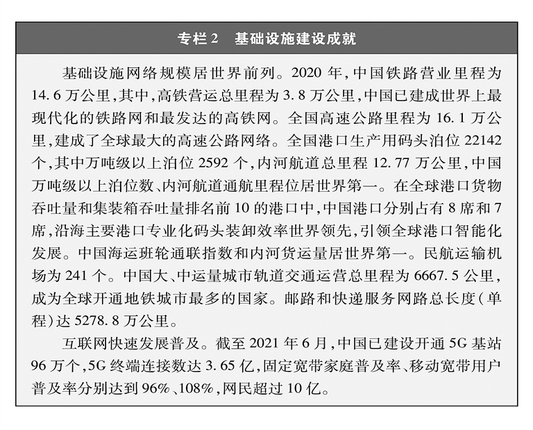 现代基础设施网络持续完善。信息畅通、公路成网、铁路密布、大桥巍峨,天涯成咫尺,天堑变通途(专栏2)。“五纵五横”综合运输大通道基本贯通,高速铁路、高速公路、城市轨道交通运营总里程和港口深水泊位数量均居世界第一,民航运输总周转量连续多年位居世界第二,中国加快向交通强国迈进。四通八达的交通网络深刻影响了城市格局、人口布局和经济版图,深刻改变了人们的生活圈、工作圈。能源供给保障能力和能源开发技术水平持续提升,能源开发效率明显提高,基本形成煤、油、气、核和可再生能源多轮驱动高质量发展的能源生产体系。水利基础设施不断完善,中国以占世界6.6%的淡水资源支持和保障了占世界近20%的人口和17%的经济总量。互联网基础设施建设加速推进,网络覆盖越来越广、资费越来越低、网速越来越快,随时随地可以一键互联、一“网”打尽,信息高速路畅通了人民幸福路。