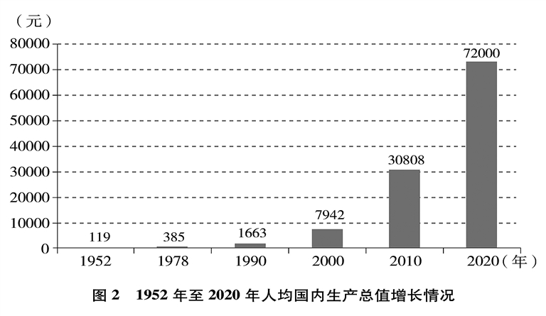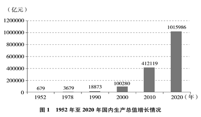 经济实力大幅提升。中国国内生产总值从1952年的679.1亿元跃升至2020年的101.6万亿元,经济总量占全球经济比重超过17%,稳居世界第二大经济体(图1)。人均国内生产总值从1952年的几十美元增至2020年的超过1万美元,实现从低收入国家到中等偏上收入国家的历史性跨越(图2)。制造业增加值多年位居世界首位,220多种工业产品产量居世界第一,自2010年起连续11年位居世界第一制造业大国。中国已是全球货物贸易第一大国、服务贸易第二大国、商品消费第二大国、外汇储备第一大国,2020年利用外资居全球第一。不断迈向共同富裕的14亿多人口,其中有超过4亿并不断扩大的中等收入群体,是全球最具成长性的超大规模市场,中国经济充满活力,具有巨大潜力和充足后劲。2020年,中国率先控制新冠肺炎疫情,率先复工复产,率先实现经济增长由负转正,充分彰显中国经济的强劲韧性。