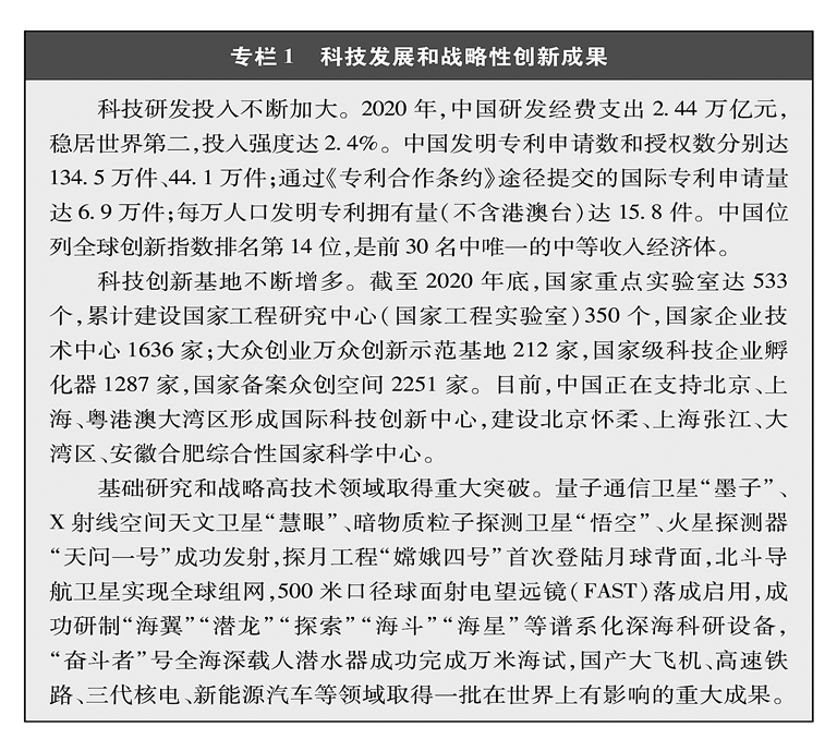 科技实力跨越式发展。科技支撑起小康梦。从新中国成立初期连火柴、铁钉都要依靠进口,到量子信息、铁基超导、中微子、干细胞、脑科学等前沿方向取得一系列重大原创成果,到载人航天与探月、北斗导航、载人深潜、高速铁路、5G移动通信、超级计算等一大批战略高技术领域取得重大突破,中国跻身创新型国家行列,正在从科技大国迈向科技强国(专栏1)。科技广泛应用于生产领域,创新驱动发展成效显著,科技进步贡献率超过60%。科技显著提升治理水平,数字政府、数字社会、数字乡村、智慧城市、“互联网+政务服务”等加快普及,网格化网络化智能化治理渐成常态。科技深刻改变人们的生活,网络点餐购物、移动扫码支付、网约车出行、共享单车出行、线上办公、在线教育、远程医疗、智能家居等,给人们带来的不仅是更多的便利,还有更充分的自由、更全面的发展。