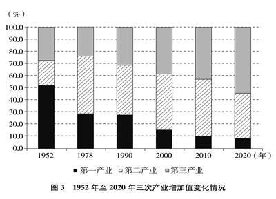 产业结构优化升级。中国已建成世界上最完整的产业体系,产业发展持续向中高端迈进。三次产业增加值之比从1952年的50.5∶20.8∶28.7到2020年的7.7∶37.8∶54.5,中国从传统农业大国成为工业大国、服务业大国(图3),中国经济从依赖单一产业为主转向依靠三次产业共同带动。农业现代化成效显著,机械化、数字化、绿色化、功能化、共享化水平明显提高,广大农民逐步告别“面朝黄土背朝天、一身力气百身汗”的辛劳,农村生产力极大解放;粮食生产能力稳步提升,实现谷物基本自给,中国人把饭碗牢牢端在自己手中。中国建成门类齐全、独立完整的现代工业体系,工业化和信息化融合发展的广度和深度不断拓展,“中国制造”向“中国智造”转型升级,产业链供应链现代化水平进一步提升。以新一代信息技术、生物技术、高端装备、绿色环保为代表的战略性新兴产业发展迅速,成为引领高质量发展的重要引擎。数字经济激发经济发展新活力,产业数字化和数字产业化趋势加快。现代服务业加速发展,以“互联网+”为标志的新业态、新模式层出不穷,平台经济、共享经济蓬勃兴起,生产性服务业向专业化和高端化发展,生活性服务业向精细化和高品质转变。产业结构的优化升级促进了经济更加均衡、更加充分的发展,人们个性化品质化多样化需求不断得到满足。