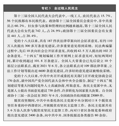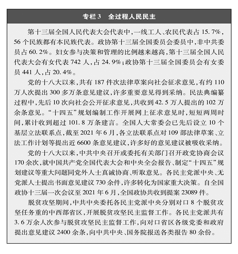 人民享有广泛民主权利。在中国,国家一切权力属于人民。人民依法实行民主选举、民主协商、民主决策、民主管理、民主监督(专栏3)。在中国,年满18周岁、具有中华人民共和国国籍、依法享有政治权利的公民,都有选举权和被选举权。坚持普遍、平等、直接选举和间接选举相结合以及差额选举、无记名投票的原则,依法保障人人享有平等的选举权利。社会主义协商民主广泛多层制度化发展,人民通过各种途径、渠道、方式,就改革发展稳定重大问题,特别是事关人民切身利益的问题广泛协商,找到全社会意愿和要求的最大公约数。党和国家制定实施重大决策,广泛征求和听取各方面意见,最大限度吸纳民意、汇集民智、凝聚民力,努力实现决策科学化民主化。人民广泛、直接参与社会事务管理,实现自我管理、自我服务、自我教育、自我监督。人民依照宪法和法律规定,有权对国家机关和国家工作人员提出批评和建议,有权对国家机关和国家工作人员的违法失职行为提出申诉、控告或者检举。民主选举、民主协商、民主决策、民主管理、民主监督各个环节环环相扣、彼此贯通,实现过程民主和结果民主、形式民主和实质民主、直接民主和间接民主相统一,保障了人民的知情权、参与权、表达权、监督权。