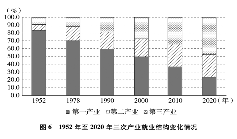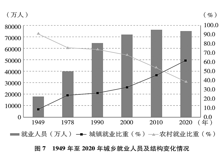 就业局势长期稳定,就业质量显著提升。就业人数从1949年的1.8亿增加到2020年的7.5亿,就业规模不断扩大;从绝大多数劳动者以农业为生到第三产业就业人数占47.7%(图6)、城镇就业人数占61.6%(图7),就业结构不断优化;从劳动者普遍处于文盲半文盲状态到劳动年龄人口平均受教育年限10.8年、技能人才总量约2亿,就业人员素质大幅提高。亿万劳动者拥有自己热爱的工作,开启幸福生活的大门。从计划分配到市场就业、自由择业、自主创业,从传统就业方式到新就业形态,劳动者的就业观念深刻变革、就业空间更加广阔、就业方式日益多元。人们的兴趣爱好、特长禀赋与个人就业意愿、社会需求、国家需要更好结合,自我价值更好实现,主动性创造性显著增强,创新创造热情不断迸发。劳动者合法权益得到保障,劳动报酬保持增长,劳动所得受到保护,人们越来越有尊严地劳动、快乐地劳动,依靠自己的双手创造美好生活。从“单休制”到“双休制”,从“黄金周”到带薪年休假,劳动者休息休假权益越来越有保障,工作生活更加平衡。劳动最光荣、最崇高、最伟大、最美丽日益成为全社会的共识和行动,勤奋做事、勤勉为人、勤劳致富成为风尚,崇尚劳动、尊重劳动、热爱劳动的社会氛围更加浓厚。