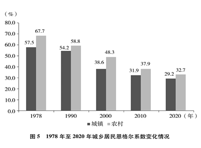 人民生活水平显著提高。居民收入持续增加,全国居民人均年可支配收入从1978年的171元增加到2020年的32189元(图4)。城乡居民恩格尔系数分别从1978年的57.5%、67.7%下降到2020年的29.2%、32.7%(图5),城乡居民生活质量不断提升。温饱问题解决后,人们对生活品质、品位有了更高的追求,衣食住行不断升级,消费结构从生存型逐渐向发展型、享受型过渡。衣,从穿暖到穿美、穿出时尚;食,从吃饱到吃好、吃出健康;住,从有所居到更敞亮、更宜居;行,从便利通畅到快捷舒适。吃穿用有余,家电全面普及,乘用汽车快速进入寻常百姓家。餐饮、健康、教育、旅游、文娱等服务性消费持续快速增长,在居民人均消费支出中占比逐渐达到一半左右。越来越多的人有“钱”有“闲”,“诗和远方”更加触手可及,“说走就走”不再是梦想,旅游扮靓人们的幸福生活,中国正在进入大众旅游时代。