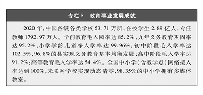 教育事业蓬勃发展。从文盲半文盲大国到教育大国、迈向教育强国,从人口大国到人力资源大国、迈向人力资源强国,中国已建成包括学前教育、初等教育、中等教育、高等教育等在内的当代世界规模最大的教育体系,教育现代化发展总体水平跨入世界中上国家行列(专栏5,表1)。学前教育普及率、普惠率超过84%,九年义务教育巩固率达到95%以上,高中阶段教育全面普及,区域、城乡、校际教育差距逐步缩小,从“有学上”到“上好学”、从“学有所教”到“学有优教”,中国基础教育跨越式发展,让每个孩子都能享有公平而有质量的教育正在变为现实。中国高等学校累计培养近亿名高素质专门人才,高等教育进入普及化阶段,教育水平跃升至世界中上国家水平。职业技术教育不断发展,为经济社会发展输送大量高素质技能人才,培养越来越多的能工巧匠、大国工匠。特殊教育从无到有、加快发展,残疾人享有平等受教育权正在实现。网络化、数字化、个性化、终身化的学习体系加快构建,“人人皆学、处处能学、时时可学”的学习型社会正在形成,学习逐渐成为人们的日常习惯和生活方式。中国的教育,畅通了向上流动的通道,改变了无数人的命运,实现了无数人的梦想,让人们拥有更多人生出彩的机会。