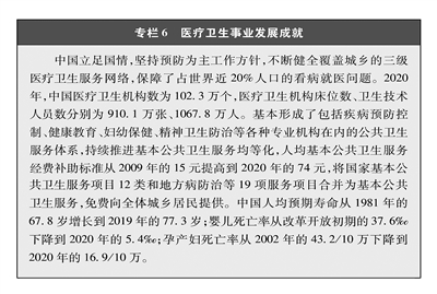 全民健康托起全面小康。新中国成立以来,从疫病横行到可防可控,从缺医少药到病有所医,从只能本地报销到逐步异地结算,从单纯医院就医到家庭医生签约服务覆盖面不断扩大,中国医疗卫生体系逐步健全,医疗资源配置进一步优化,人们看病难、看病贵的问题逐步得到缓解(专栏6)。医疗技术水平和服务能力不断提升,“互联网+医疗健康”持续发展,医药价格逐步回归合理水平,越来越多的常用药、救命药纳入医保目录,人民群众看得上病、看得起病、看得好病。城乡基本医疗公共服务均等化不断推进,农村医疗卫生服务体系持续改善,医疗保障制度不断健全,农村居民看病就医有地方、有医生、有保障,因病致贫、因病返贫问题得到有效解决。健康中国行动加快推进,全民健身和全民健康持续融合,有利于健康的生活方式、生产方式、经济社会发展模式和治理模式正在形成。人民健康水平不断提升,从新中国成立之初处于世界平均水平到现在处于中等收入国家前列。中国取得抗击新冠肺炎疫情重大战略成果,中国医疗卫生体制的优越性进一步彰显,人民生命健康得到有效维护。