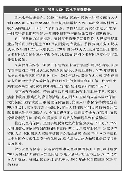 贫困群众与全国人民一道迈进小康。实施精准扶贫方略,做到扶持对象、项目安排、资金使用、措施到户、因村派人、脱贫成效“六个精准”,实施发展生产、易地搬迁、生态补偿、发展教育、社会保障兜底“五个一批”。到2020年底,中国如期完成新时代脱贫攻坚目标任务,现行标准下9899万农村贫困人口全部脱贫,832个贫困县全部摘帽,12.8万个贫困村全部出列。少数民族和民族地区脱贫攻坚成效显著,到2020年底,内蒙古自治区、广西壮族自治区、西藏自治区、宁夏回族自治区、新疆维吾尔自治区和贵州、云南、青海三个多民族省份3121万贫困人口全部脱贫;28个人口较少民族全部实现整族脱贫,一些新中国成立后“一步跨千年”进入社会主义社会的“直过民族”,又实现了从贫穷落后到全面小康的第二次历史性跨越。农村建档立卡贫困人口的收入和福利水平大幅提高,“两不愁三保障”全面实现,教育、医疗、住房、安全饮水等条件明显改善,既满足了基本生存需要,也为后续发展奠定了基础(专栏8)。从2016年起,通过大力实施易地扶贫搬迁,960多万居住在“一方水土难养一方人”地方的建档立卡贫困人口告别穷山恶水之地,易地搬迁,实现了脱贫。脱贫攻坚唤醒了贫困群众对美好生活的追求,提振和重塑了自力更生、自强不息、勤劳致富、勤俭持家、创业干事、创优争先的精气神,增强了脱贫致富的信心和劲头。脱贫攻坚任务目标完成后,对脱贫地区、脱贫人口实施跟踪监测,设立一定过渡期保持帮扶政策总体稳定,定期检查、动态管理,早发现、早干预、早帮扶,提升脱贫地区自主发展能力,激活脱贫人口自我发展动力,确保稳定脱贫、防止返贫。