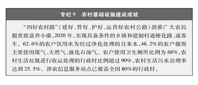 乡村走向繁荣发展。乡村振兴战略深入实施,农业全面升级、农村全面进步、农民全面发展的目标逐步实现。农业现代化加快推进,粮食和重要农产品供给保障能力进一步提升,粮食产量连续6年稳定在1.3万亿斤以上,果菜茶肉蛋鱼等产量稳居世界第一。农业综合生产能力稳步提升,农业科技进步贡献率超过60%,农作物耕种收综合机械化率达到71%。设立中国农民丰收节,中国农民有了自己的专属节日。以种植业为主的农业经济转变为农林牧副渔全面发展和一二三产业融合发展,农业农村多种功能不断拓展,特色生态产业、农村电商、乡村旅游、休闲农业、文化体验、健康养老等新产业、新业态加快发展,推动乡村产业走向全面振兴。农村基础设施建设持续加强,硬化路、动力电、4G网基本实现行政村全覆盖,农村物流水平稳步提升,快递基本实现“乡乡有网点”并加快“进村”步伐。越来越多的农村实现水源净化、道路硬化、夜晚亮化、能源清洁化、人居环境美化(专栏9)。农房和村庄建设现代化加快推进,厕所革命成效显著,乡村建设整体水平不断提升,许多曾经的偏僻穷困乡村,如今旧貌换新颜,村如公园、户有花园,成为农民宜居宜业的美丽家园。农村彻底扫除青壮年文盲,九年义务教育全面巩固、质量持续提高,人口素质显著增强。健康乡村建设全面推进,村卫生室标准化建设和健康管理水平进一步提升,农民健康水平和人均寿命大幅提高。从农家书屋、文化礼堂到健身广场,农民文化生活丰富多彩。农民的开放意识、创新意识、科技意识、法治意识、市场意识等现代观念显著增强,简朴节约、绿色环保、讲究卫生等科学、健康、文明的生活方式成为新追求,婚事新办、丧事简办、孝老爱亲、扶危济困、扶弱助残等社会风尚广泛弘扬,既有乡土气息又有现代时尚的新时代乡村文明新风正在形成。一个个山清水秀、文明和谐、宜居宜业、欣欣向荣的美丽村庄正渐次出现在中国大地上,农业强、农村美、农民富的目标不断实现。下转B04版▶