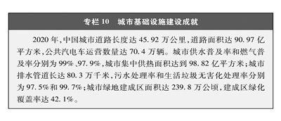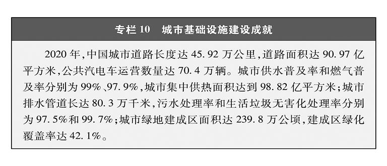 城镇化水平持续提高。城镇化是现代化的必由之路,是实现全面小康的幸福之路。新中国成立前,中国大地上城镇寥若晨星、衰败破落;今天的中国,城镇繁星璀璨、繁华时尚。中国经历了世界近现代史上规模最大、速度最快的城镇化进程,从1949年至2020年,常住人口城镇化率由10.6%提高到63.9%,城市数量由132个增长到687个,建制镇数量由2000个增长到2.1万多个。现代化国际化的大都市、厚重雍容的历史古都、典雅精致的文化名城、类型迥异的特色小镇,星罗棋布,城城不同,风景各异。城镇化的加快推进,形成了面积庞大、人口众多、联系紧密的城市群,成为经济发展和现代化建设的重要载体,提升了城市运行效率和居民生活质量。中国基本形成以城市群为主体、都市圈为依托,大中小城市和小城镇协调发展的城镇体系。