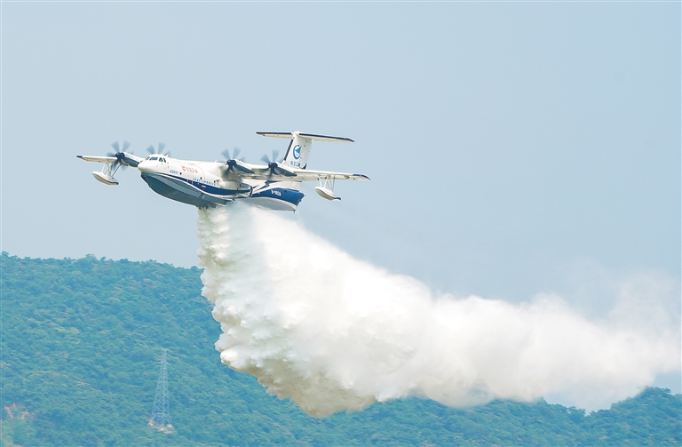 此次首秀是由4名成员组成的机组按预定科目和计划,从珠海机场跑道起飞,在本场进行飞行投水功能演示,9吨水随着飞机下部投汲水舱门的打开倾泻而下,精准覆盖投水目标区域,投水后飞机状态良好,响应特性正常,投水任务系统及飞机其他各系统工作稳定。
