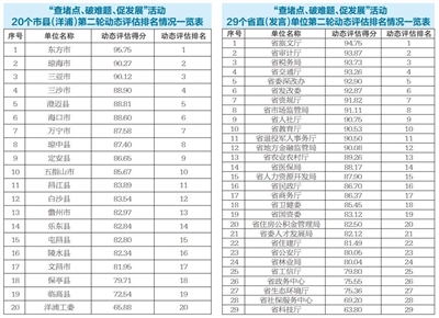 本报海口9月29日讯 (记者彭青林 通讯员王勇)近期,省“查堵点、破难题、促发展”活动办公室对各市县各单位开展第二轮动态评估。9月29日,公布了对部分单位开展第二轮动态评估排名的情况,涉及19个市县及洋浦经济开发区、29个省直单位。评估结果显示,与首轮动态评估相比,排名前列的单位变动较大,评估平均得分进一步提高,表明各市县各单位更加积极地投入到查找堵点、破解难题、促进发展活动中来,持续推动“查堵点、破难题、促发展”活动深入开展,“比学赶超”的良好局面正在形成。