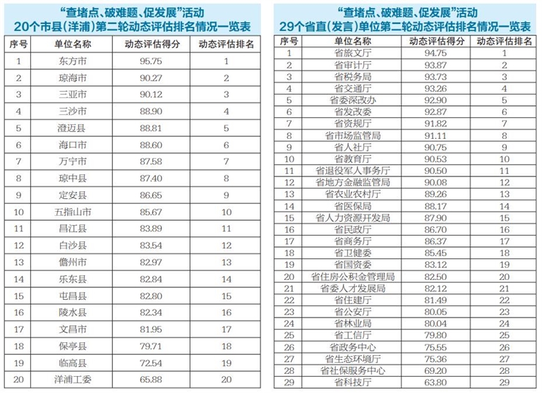 根据排名结果,省旅文厅、省审计厅、省税务局、省交通厅、省委深改办位列29个省直单位动态评估排名前五,东方市、琼海市、三亚市、三沙市、澄迈县位列20个市县(含洋浦)动态评估前五。