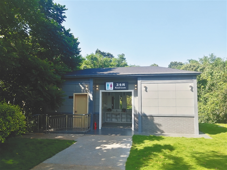 在符世礼的指引下,记者在一片绿茵上见到了他口中的公共厕所。这间公厕外立面以灰白为主,颜色和村里白墙灰瓦的建筑接近;内部设施齐全,卫生清洁到位。在洗手台上,管理方摆放了绿色植物,让人眼前一亮。