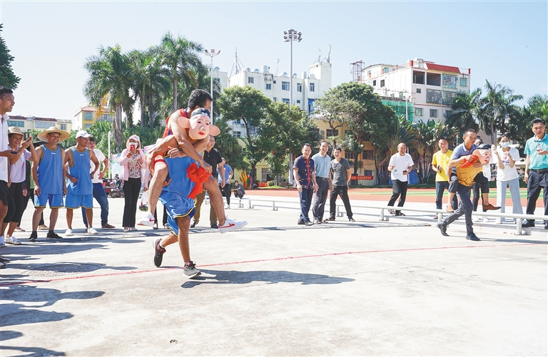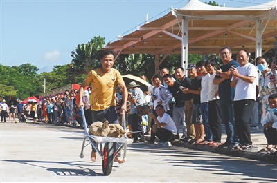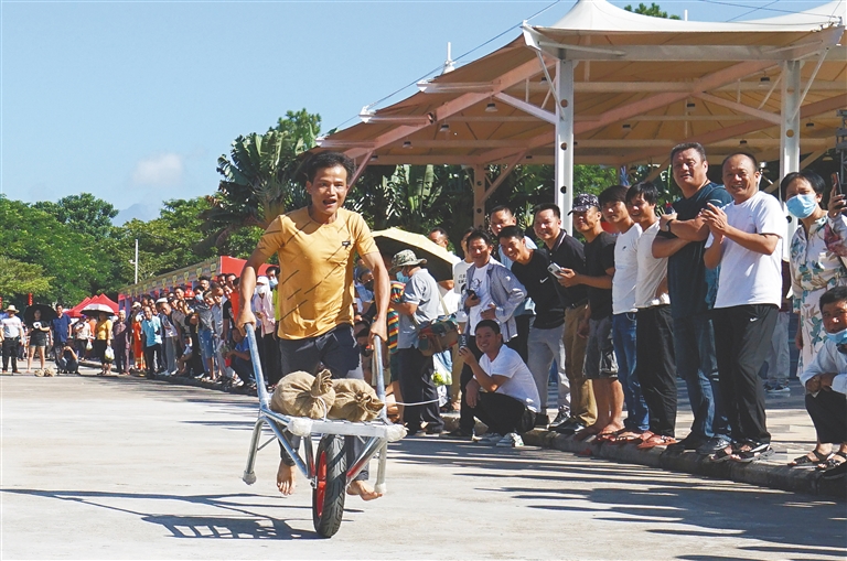 丰收节活动也是乐东促进旅游消费、助力乡村振兴的重要举措。庆祝活动现场,举办农民趣味运动会,开展了独轮车运粮、椰子保龄球、抗旱保苗、猪八戒背媳妇等4个让人乐翻天的比赛项目;举办趣味游园活动,套圈、打铜锣、尖峰岭套娃、龟兔赛跑等趣味活动,吸引市民和游客参与;当晚,还举办以“颂党恩·庆小康”为主题的乐东乡村音乐节,邀请乐东以及省内知名音乐人演出,把庆祝活动推向高潮,为当地居民及外来游客奉上一场丰收文化大餐。