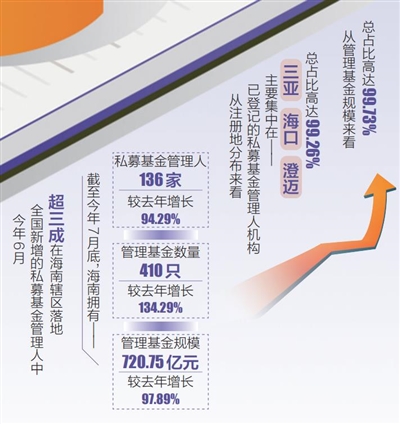 对于海南基金业而言,过去一年多以来可谓是私募基金的“爆发期”。统计数据显示,去年6月至今,在海南自贸港注册的基金管理人和基金管理规模均实现快速增长。截至今年7月底,海南拥有私募基金管理人136家,管理基金数量410只,管理基金规模(净资产)720.75亿元(人民币,下同),分别较去年底增长94.29%、134.29%、97.89%。