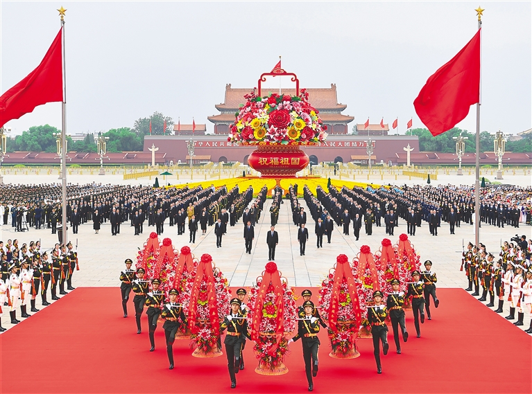 庄严的天安门广场上,鲜艳的五星红旗高高飘扬。广场中央,“祝福祖国”巨型花篮表达着对国家繁荣昌盛的美好祝愿,花篮上“欢度国庆”的字样分外醒目。人民英雄纪念碑巍然耸立,北侧两组花坛上镶嵌着白菊、康乃馨等鲜花组成的18个花环,寄托着全体中华儿女对英烈的深情追思。