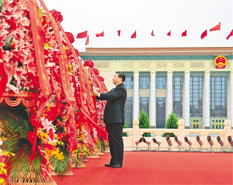 习近平迈步向前,仔细整理花篮缎带。接着,习近平等党和国家领导人缓步绕行,瞻仰人民英雄纪念碑。