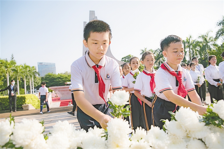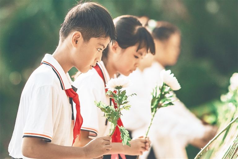 少先队员为烈士献花,表情肃穆。本报记者 封烁 摄