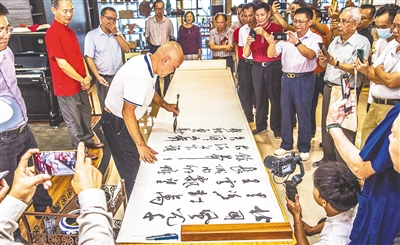 国庆期间,儋州各界开展多项主题活动,表达对祖国的祝福和对未来的美好期盼。图为10月1日上午,在儋州市的诗乡歌海文化会馆里,书法家同台挥毫书写诗词。