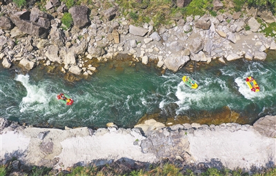 游客在贵阳市开阳县南江大峡谷景区体验漂流。