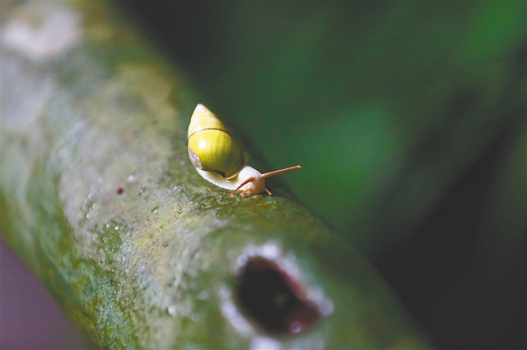 在记者凝视石灰岩表层,感慨大自然的鬼斧神工之时,一只不知名的螺缓慢进入了视线。“这是石灰岩上寄生的烟管螺,在这里很常见,离开这里却很难找到。”张智华得意地说道,在俄贤岭,最为独特的生物就是贝类,这得益于喀斯特地貌形成的特有的陆生和水生系统。