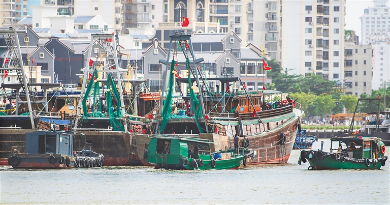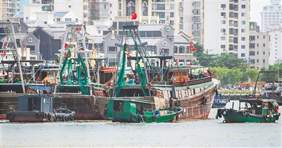 10月7日,在海口市海甸溪,渔民将渔船停靠在港口并完成防风加固工作后纷纷上岸,截至目前,我省2万余艘渔船陆续回港避风。本报记者 袁琛 摄