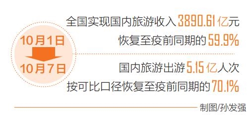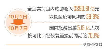 新华社北京10月7日电(记者余俊杰)记者7日晚从文化和旅游部获悉,10月1日至7日,全国实现国内旅游收入3890.61亿元,恢复至疫前同期的59.9%。
