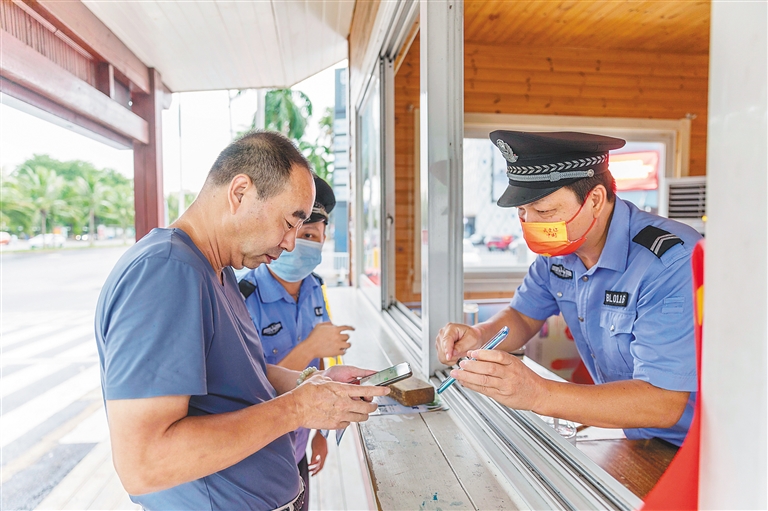 10月7日,在海口秀英港,工作人员建议旅客通过手机及时关注港口通航消息。本报记者 李天平 摄