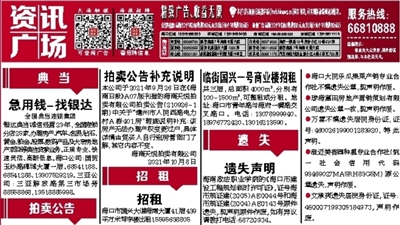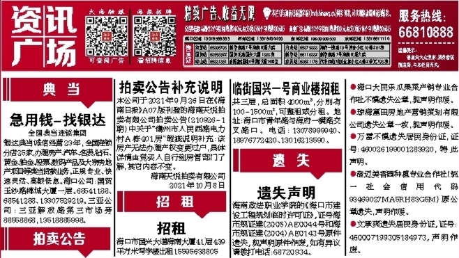 本公司于2021年9月26日在《海南日报》A07版刊登的海南天悦拍卖有限公司拍卖公告(210926-1期)中关于“儋州市人民西路电力村A栋401房”瑕疵说明补充:该房产无法办理产权变更过户,具体详情由竞买人自行到房管部门了解;其它内容不变。