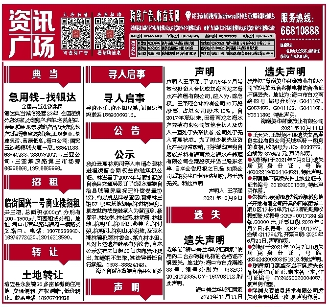 ●朱枫池、徐丽娜遗失海南新榕房地产开发有限公司开具的四季康城二期D区17栋1单元1403房的购房收据贰张,收据号:XRF-0017184,金额:50000元,开票日期:2020年6月7日;收据号: XRF-0017571,金额:211794元,开票日期:2020年6月21日,声明作废。