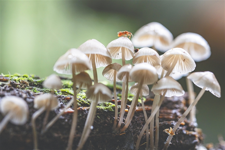 竹节虫把自己伪装成一截树枝,苔藓、地衣和真菌藏进树皮的缝隙里,一团团翠绿的蕨类附生在枝桠上形似鸟巢,种类众多的兰科、苦苣苔科,甚至是杜鹃花科植物正肩挨着肩绽放奇异花朵……