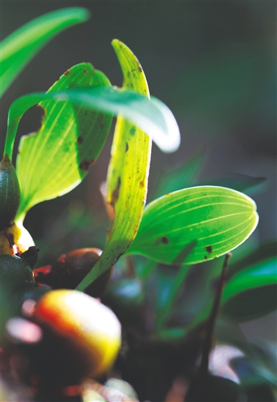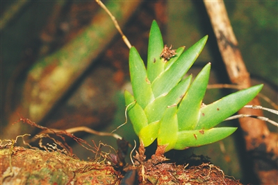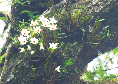 根据海南大学生态科研工作人员的调查结果显示,附生兰在海南分布最为丰富,地生兰次之,腐生兰最少。附生兰,顾名思义,即附着生长于树干,其中,黄叶树、蚊母树、碎叶蒲桃等都是附生兰在海南热带雨林里的主要“宿主”;当然,也有附生兰附着生长于坚硬的石壁缝隙里,在这般逆境里,为了争取阳光,汲取更多的营养,附生兰具有肥厚且带根被的气生根多裸露于空气中,这样就能从空气中吸收一定的水分,或是将一部分膨大变成肉质假鳞茎用于保存水分而赢得了生存机会。