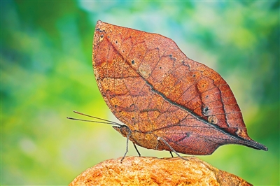 枯叶蝶,中文学名枯叶蛱蝶。枯叶蝶的翅膀反面色泽和形态均似一片枯叶,翅脉模拟叶脉,翅上的黑斑又好似枯叶的霉斑,后翅的末端,还拖有一条叶柄般的“小尾巴”,甚至是破损处也都惟妙惟肖。如此登峰造极的拟态,让它与身边的环境融为一体。这种拟态,可以为它在复杂的野外环境中躲避天敌的侵扰,为自己赢得更多的生存空间。