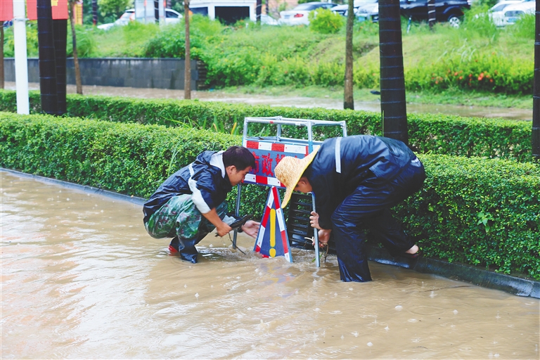 图❶ 8日,儋州市政部门排水组人员在那大主城区主要路段和低洼、易涝地段疏通排水口。黎有科 摄