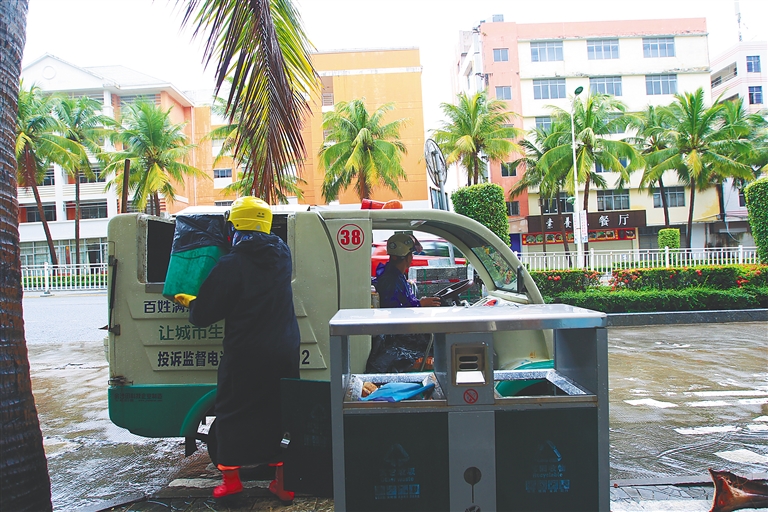 图❷ 9日,儋州美城环境服务有限公司合理调度垃圾收运车辆,不定时收集和转运,保证垃圾日产日清。何万常 摄