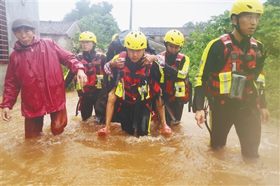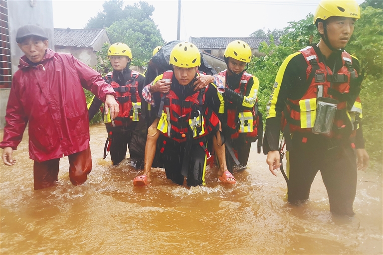 图❸ 9日上午,儋州市消防救援支队救援人员将峨蔓镇凌霄村部分被困村民转移、护送至安置点。肖洋 摄