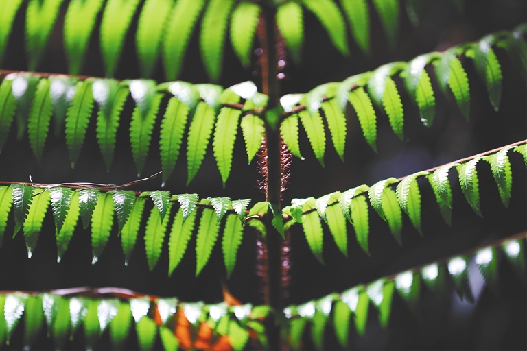 看!青梅、海南粗榧、坡垒等乔木一棵棵赛着比高,枝杈间附生簇簇蕨类似鸟巢,与动辄长达百米、天罗地网般的藤蔓一道,形成植物绞杀、老茎生花、独木成林等奇观,编织出一个迷幻的雨林秘境。