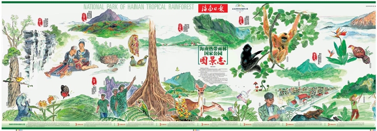这是自然的画卷。八连版正面用报纸长卷,结合水墨山水风格,绘出了海南岛中南部的逶迤峰岭和广阔茂密雨林中的一个个雨林精灵,勾起读者对这片生命天堂的无尽遐想。