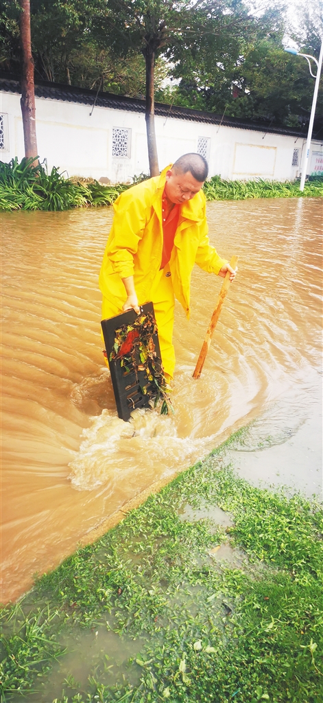 10月13日下午,台风“圆规”登陆后强度迅速减弱。海口并无暴雨,但海口排水中心美兰大队排水中队队长梁洲却还是带着队员们在街头奋战。雨水和汗水浸湿了衣服,他索性敞开了“小黄人”的外套。