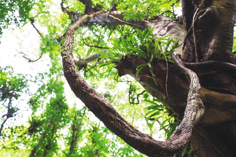 附生于雨林大树的鸟巢蕨在半空中旺盛生长,铁线蕨如野草般随意簇生于洞底和岩壁上……除了高大的树蕨外,在琼岛丰厚的蕨类“家底”中,陆生、附生、石生、水生蕨类应有尽有,在雨林的各个角落一点一点开拓出庞大的生存空间。