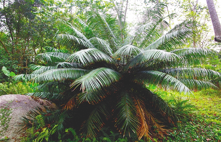 在海拔100米至1000米的海南岛低山地雨林或稀树灌丛中,野生的海南苏铁以极强的观赏形态盘踞着这一方土地。“植物界的活化石”这一称呼,揭示了苏铁是现存种子植物中,最原始的一个类群之一。