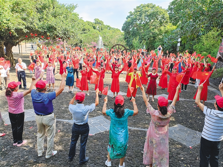 本报海口10月13日讯 (记者郭萃)“这是强大的祖国,是我生长的地方,在这片温暖的土地上,到处都有和平的阳光……”10月12日上午,“红歌唱响 情暖重阳”海口红歌联唱快闪活动在海口火山口地质公园举办。