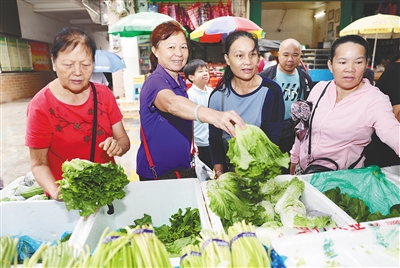 10月14日,在琼中黎族苗族自治县营根镇集贸市场平价蔬菜专营区,市民选购新鲜蔬菜。
